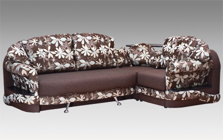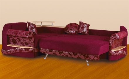 Габариты дивана (ШхГхВ), мм: 2800×1900×900. Спальное место, мм: 2250×1300. Каркас — хвойные породы древесины, многослойная березовая фанера. Механизм трансформации «Еврокнижка», на каждый день, надежный, легко раскладывается. Спинка — основа пружинный блок, настил ППУ. Сиденье — основа пружинный блок, настил ППУ. Подушки — наполнитель синтепух. Бельевой ящик — березовая фанера, белое ламинированное ДВП. Съемные подлокотники — упрощают процесс транспортировки. Подлокотники — ламинированное ДСП, цвет — бук, вишня. Обивка — под заказ (шенил, флок). Опоры — никелированные металлические изделия. Декоративный стол — ламинированное ДСП, цвет — бук, вишня. Модель с взаимозаменяемым углом — левый, правый.